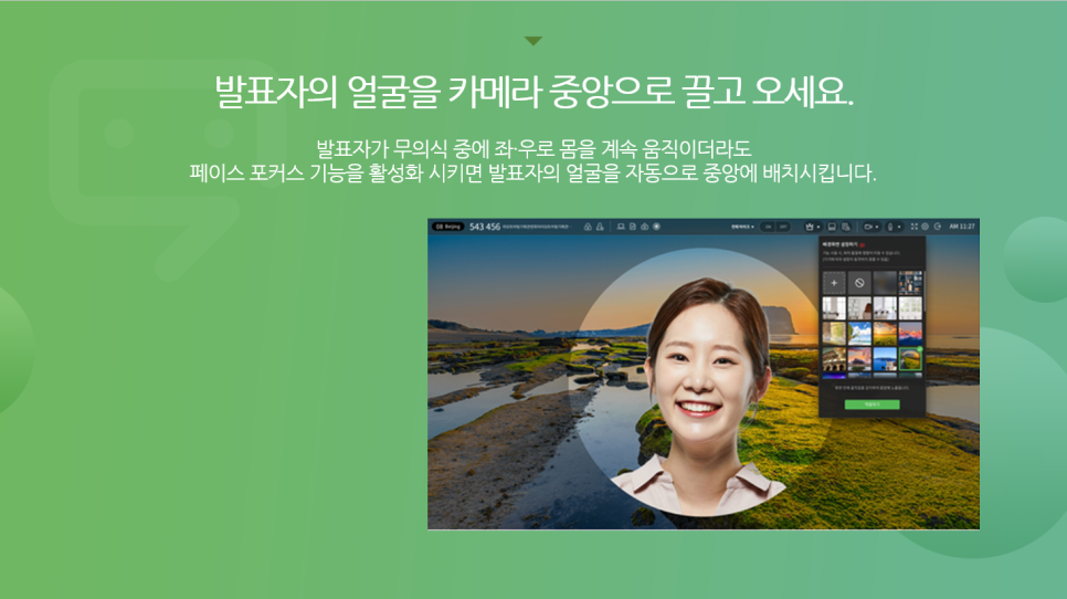 여덟 번째 Tip은 바로 "페이스 포커싱"입니다. 발표하시는 분들 중에서 발표에 대한 긴장감과 부담감 때문에 발표 도중에 자꾸 몸을 좌/우로 움직이시거나 부산스럽게 뭔가를 찾으시는 분들이 있는데요, 발표자의 부산스러운 움직임이야말로 발표의 전반적인 퀄리티를 떨어뜨리는 행위입니다. 리모트미팅에서 가상 배경을 설정하게 되면 페이스 포커싱이라는 기능을 사용할 수 있죠! 사람을 인식해서 트래킹 한 후 인물만 따서 자동으로 카메라 정중앙으로 끌고 오는 AI 기능이랍니다. 발표에 있어서는 뭐니 뭐니 해도 발표자가 주인공이기 때문에 발표자의 얼굴을 카메라 정중앙으로 끌고 오면 보다 안정적인 발표 분위기를 만들 수 있습니다.