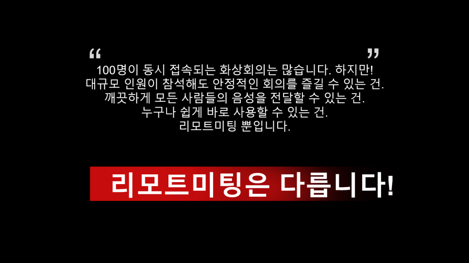 한 회의실에 몇 명이 들어가는지를 따지는 시대는 이제 지났습니다. 시장에 배포된 거의 모든 제품들이 한 회의실에 100명, 1000명이 동시 접속할 수 있는 서비스들을 선보이고 있습니다. 100명, 1000명이 동시 접속되는 기능 구현이 모두 똑같은 동일한 상태라면 이제는 100명이 한 회의실에 모두 모였을 때 ▼ 모두가 끊기지 않고 안정적으로 연결이 되는지? ▼ 100명의 목소리 모두가 하울링 없이 깨끗하게 전달되는지? ▼ 100명이 모두 쉽게 바로 사용할 수 있는지? 를 따져야 할 때입니다.