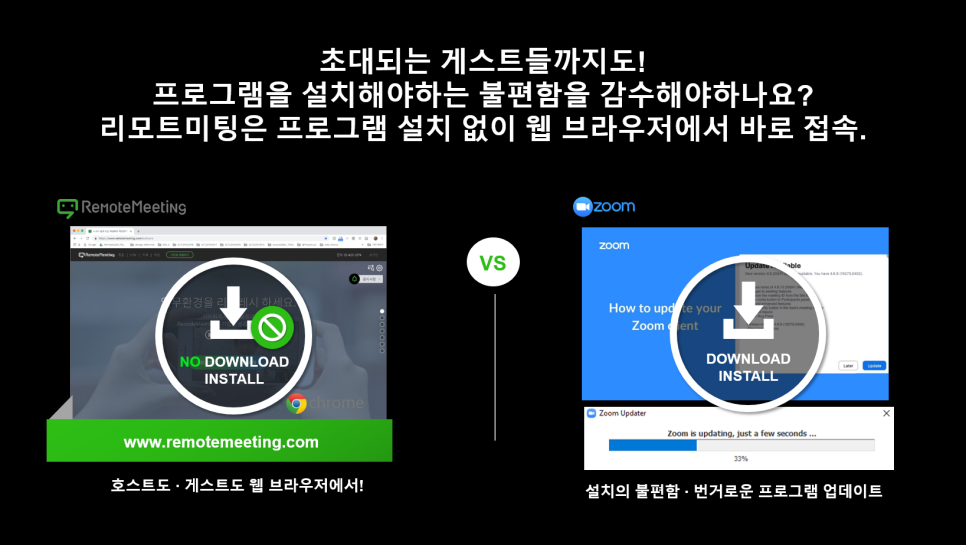 세 번째는 얼마나 쉽게 바로 접속되느냐의 차이입니다. 줌(ZOOM)은 호스트와 게스트 모두가 프로그램을 다운로드 받아야 하는 설치형 프로그램입니다. 정기적으로 화상회의를 진행하는 호스트라면 프로그램을 설치해야 하는 불편함을 감수할 수도 있겠지만 어쩌다 한번 게스트로 참여하는 참여자들까지 프로그램을 설치하고 때때마다 업데이트를 해야 한다면 굉장히 불편하고 번거롭습니다.