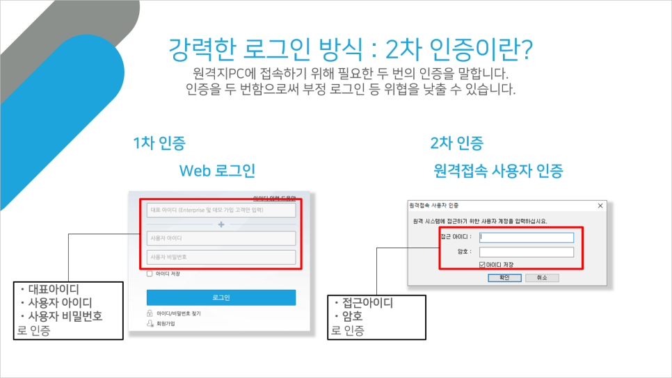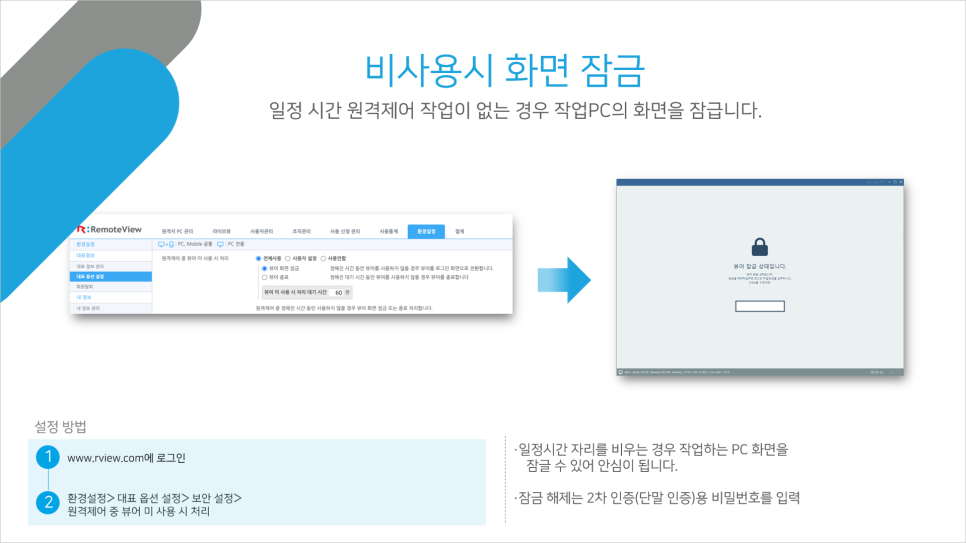 리모트뷰는 원격지 PC에 접속 시, Web 사이트에서 로그인할 때 [1차인증], 그리고 실제로 원격지 PC에 접근할 때 [2차인증], 총 두 번의 인증을 거쳐야 접속할 수 있는 구조로 더욱 안전하게 사용할 수 있습니다.