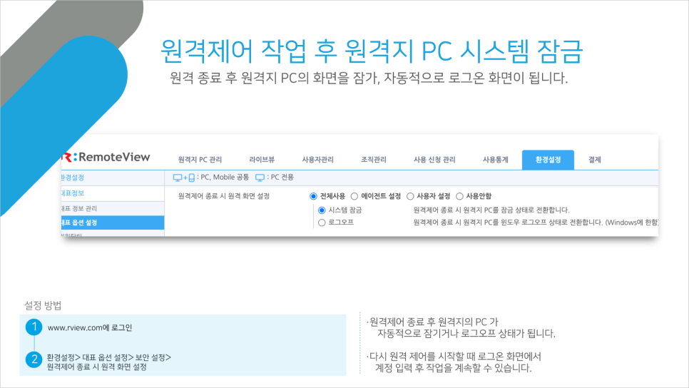원격제어를 통한 작업이 끝나고 나서 원격지 PC가 그대로 켜져 있다면..? 보안상 문제가 생길 수 있습니다. 리모트뷰는 옵션 설정에서 원격제어 종료 후 원격지 PC를 자동으로 잠그거나 로그오프 상태로 전환시킬 수 있어 안심하고 사용할 수 있습니다.