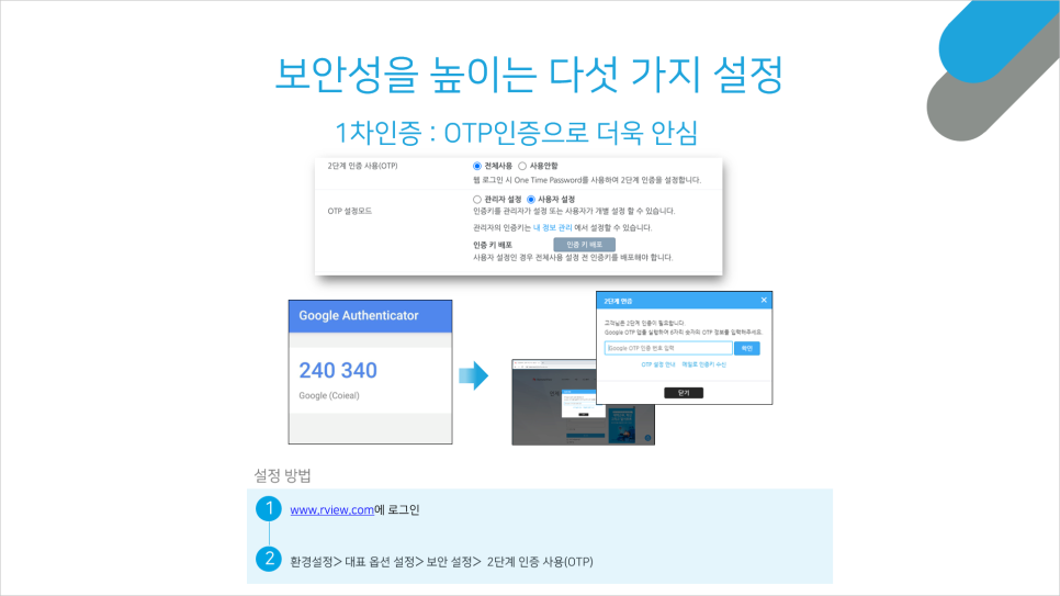 1차 인증(웹 사이트 로그인) 시, Google OTP(One Time Password) 인증을 옵션으로 설정하면 아이디/비밀번호에 + 앱을 통해 발급되는 6자리 인증번호를 추가 입력하는 2단계 인증으로 더 안전하게 접속할 수 있습니다.