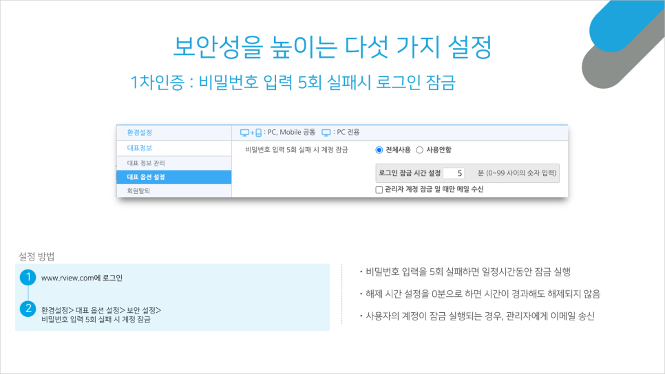 1차 인증(웹 사이트 로그인) 시, 입력하는 비밀번호를 정기적으로 변경하도록 유도하거나 연속으로 비밀번호 잘못 입력 시 더 이상 로그인을 못하도록 잠글 수 있습니다.