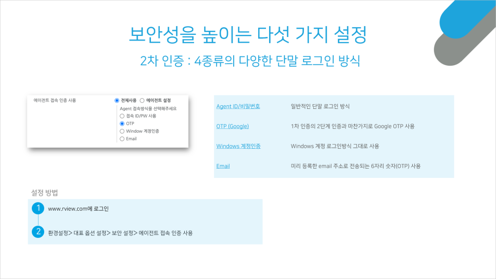 2차 인증(원격접속 사용자 인증) 시, 일반적인 ID/비밀번호 방식뿐만 아니라 Google OTP 인증, Windows 계정인증 등 다양한 단말 로그인 방식에서 골라 설정할 수 있습니다.