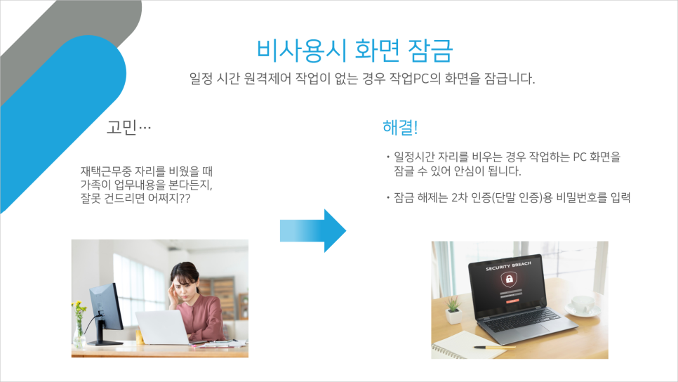 재택근무 중에 여러 가지 이유로 잠시 자리를 비워야 될 때, 그대로 자리를 떠도 될까요? 간혹 가족이 PC 화면 상의 업무 내용을 보게 되어 문제가 생기거나 아이가 PC를 잘못 건드려서 회사의 PC가 오동작을 일으키는 경우가 있답니다. 이런 상황을 미리 방지하기 위해 리모트뷰에는 일정 시간 동안 PC 비사용시 화면을 잠그거나 원격 접속을 종료시킬 수 있는 설정이 준비되어 있습니다.