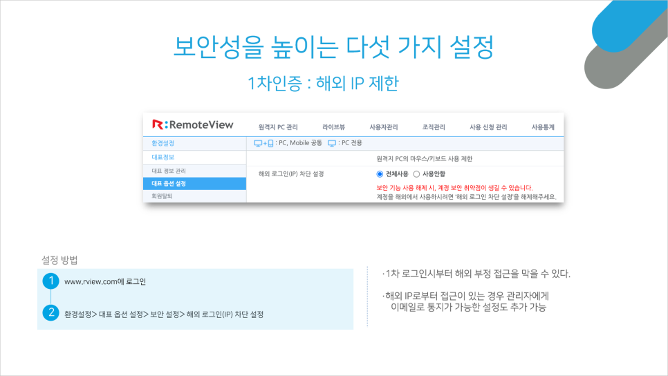 1차 인증(웹 사이트 로그인) 시, 해외로부터 접근할 수 없도록 미리 설정할 수 있습니다.