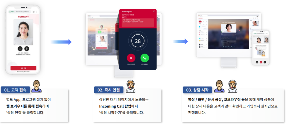 코브라우징 방식: 상담원과 고객이 동일한 화면을 보며 실시간 응대 가능