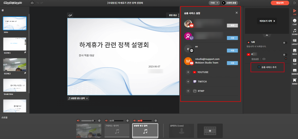 방송 시작을 하시면 선택한 계정에서