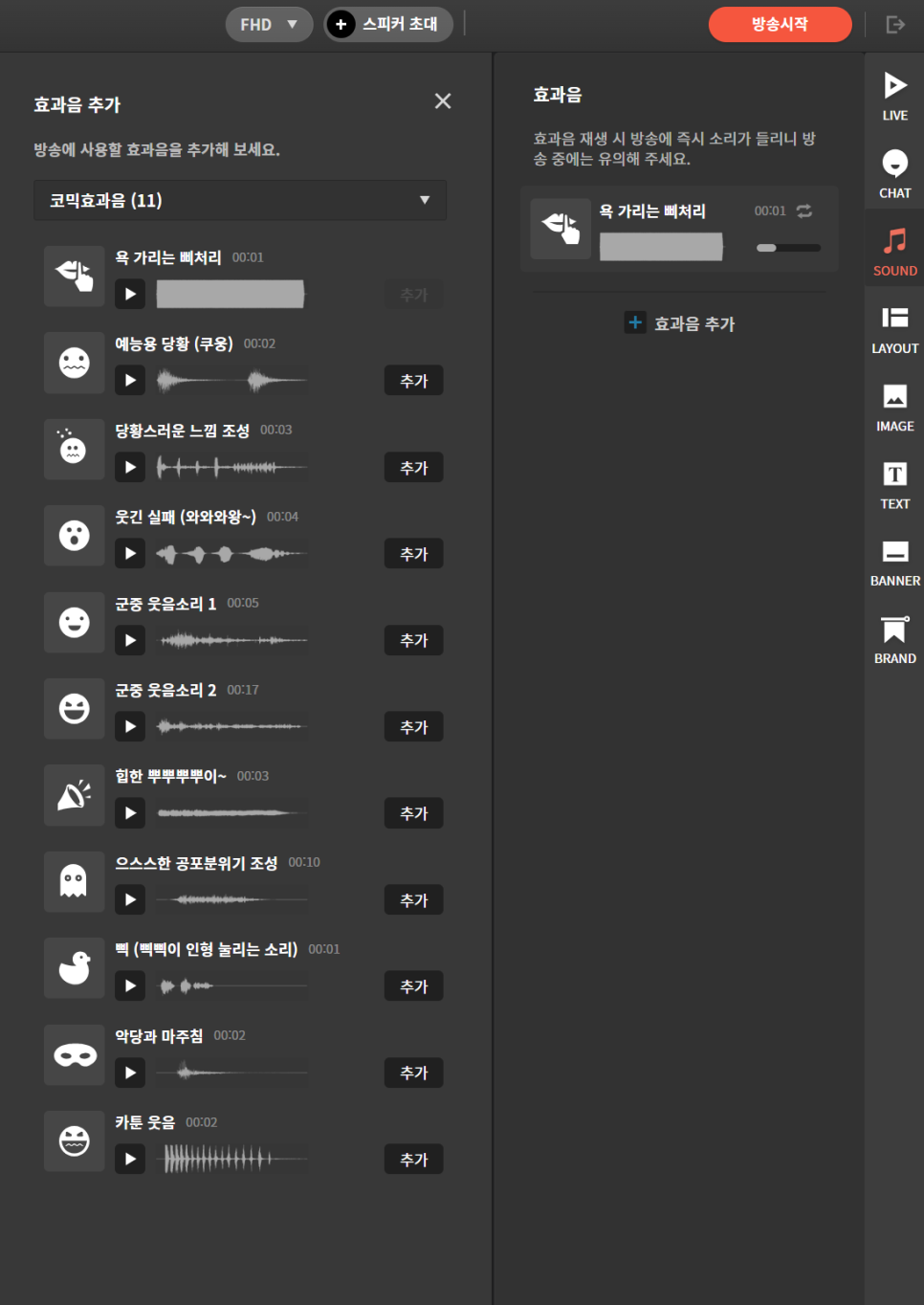 효과음 추가 버튼을 눌러 원하는 효과음을 리스트에 추가해 보세요.