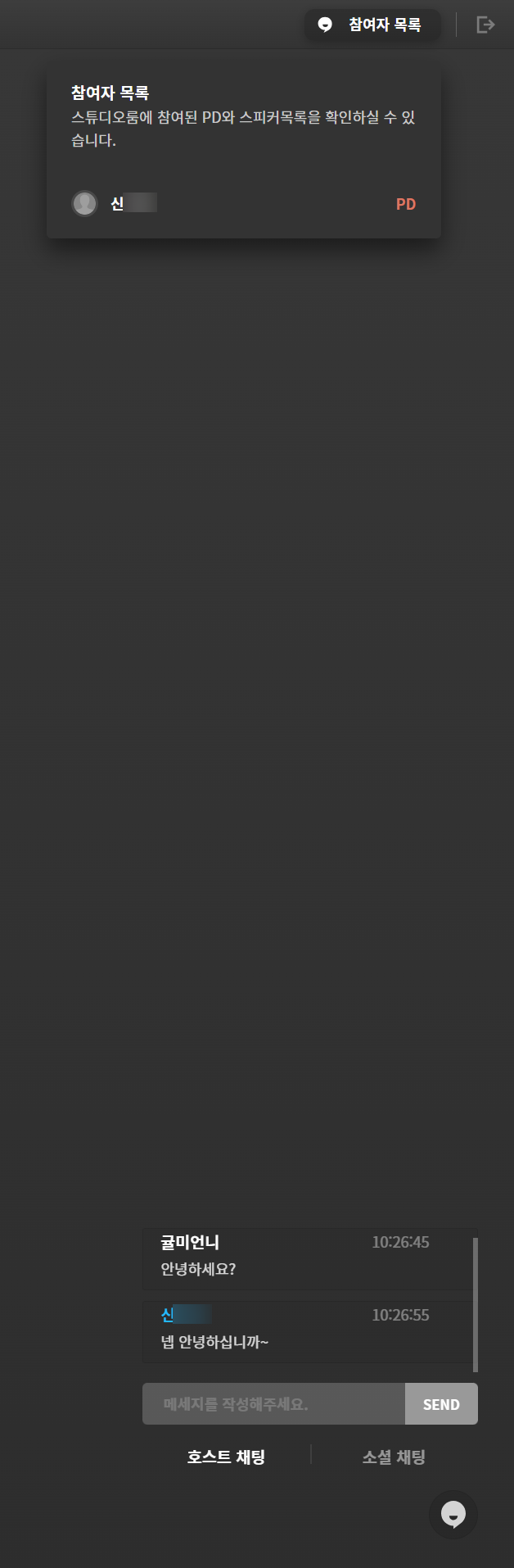 그리고 오른쪽 아래의 호스트 채팅을 활용하시면