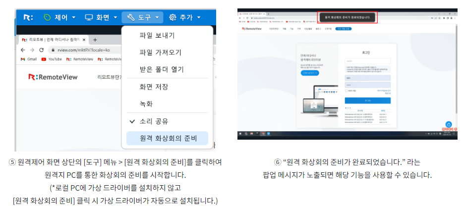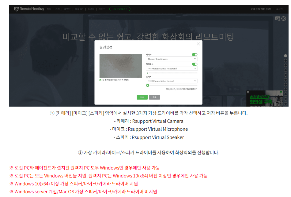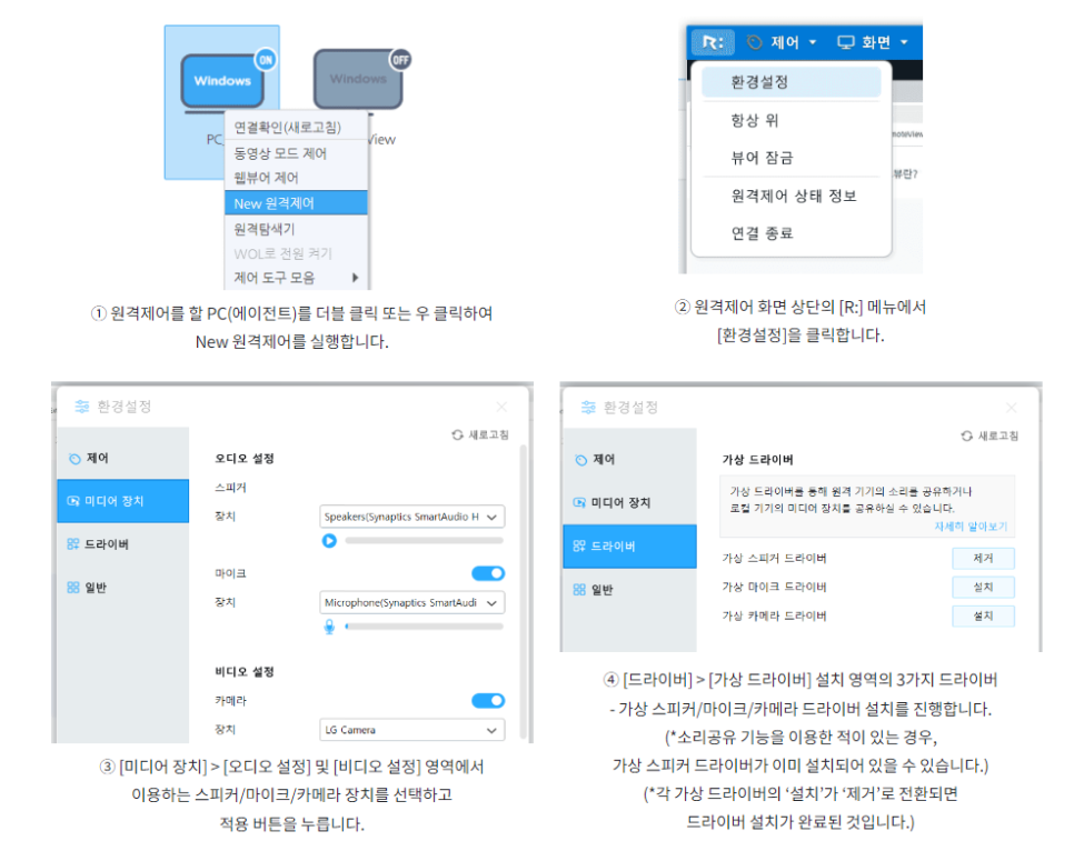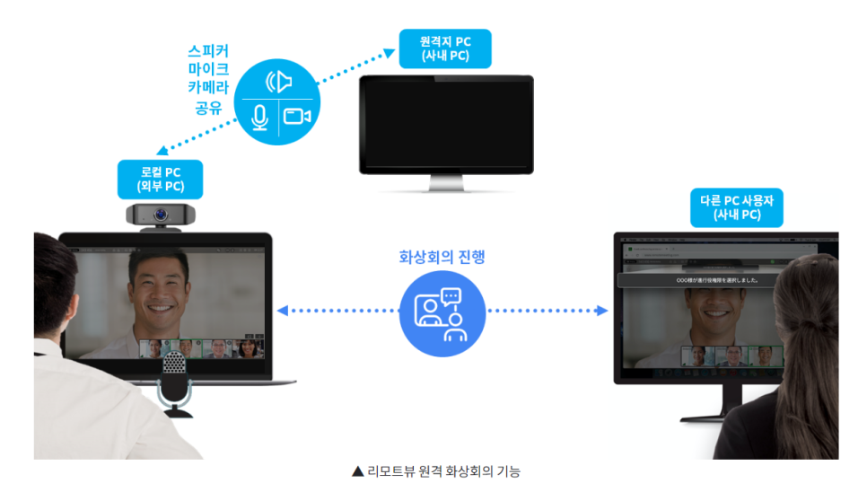 외부 출장이나 원격근무 중 사내망에 있는 기기만으로 가능한 영상 회의를 해야 할 때 유용한 기능인데요, 외부에서 원격지 PC(사내 PC)에 리모트뷰로 원격 접속 후 가상 스피커/마이크/카메라 드라이버를 설치하면 원격지 PC의 스피커/마이크/카메라 장치가 현재 사용 중인 로컬 PC(외부 PC)와 연동이 되어 외부에서도 사내망을 통해 화상회의를 할 수 있습니다.
