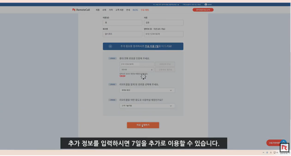 입력하면 7일간 리모트콜을 무료로 이용할 수 있으며