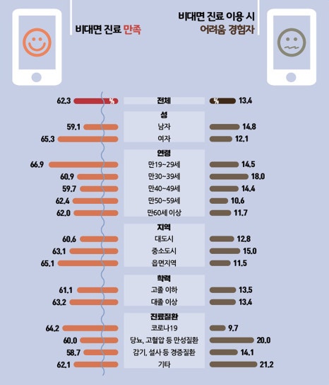 한국보건산업진흥원이 공개한 비대면진료 서비스 만족도와 디지털 헬스 역량 조사에서 비대면 진료를 경험한 환자 10명 중 9명은 앞으로도 비대면 진료를 받겠다고 대답했습니다. 디지털 헬스에 대한 이해와 활용 수준이 높을수록 비대면 진료에도 긍정적이었는데요~ 이번 조사는 '한시적 비대면 전화상담 및 처방 서비스'를 경험한 만 19세 이상 국민 1,707명을 대상으로 진행했습니다.