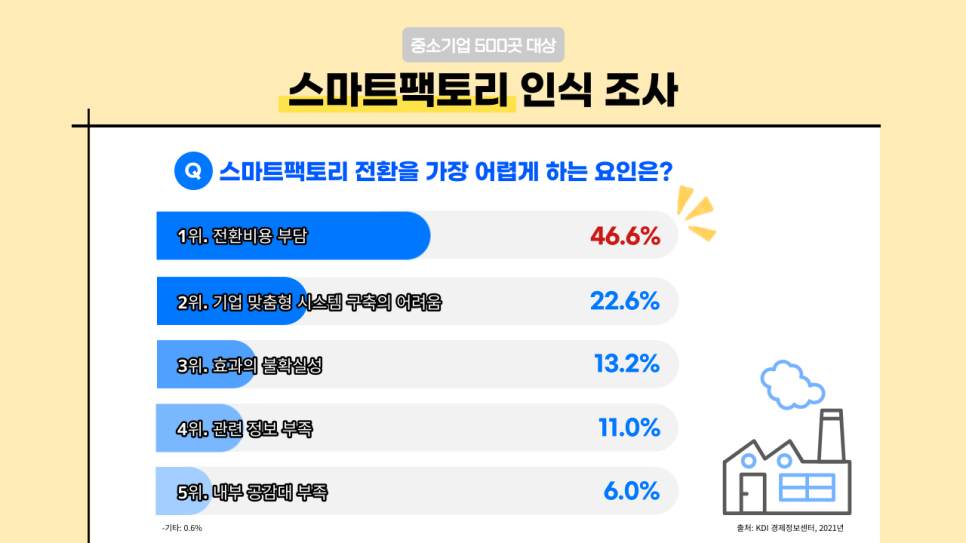 하지만 아직까지 생산 시설에서 오래된 장비를 사용하는 많은 기업들은 스마트 팩토리 구현을 어렵게 느낄 수 있습니다. 특히, 구현 비용이 많이 든다고 여겨 초반에 스마트 팩토리를 포기하는 경우도 있을 것으로 예상됩니다. 노후화된 장비와 인력 문제로 인해 생산성 저하에 대한 우려도 높아지고 있습니다.