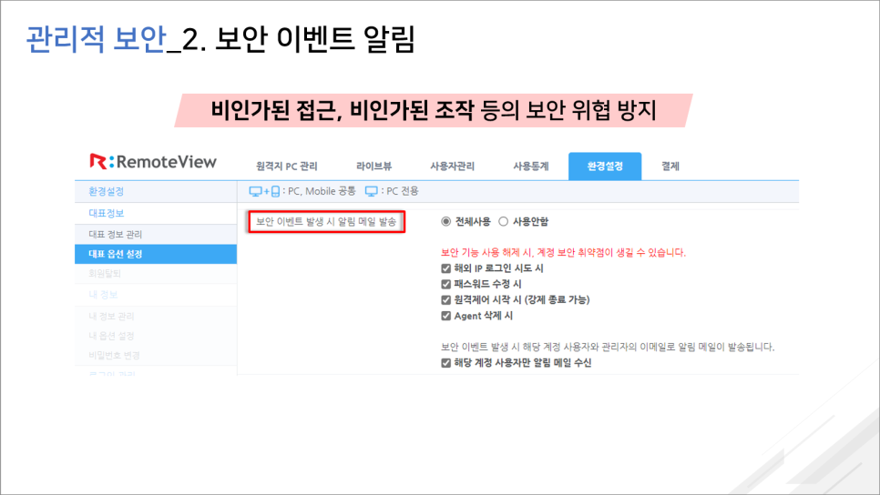 리모트뷰 관리자는 rview.com에 접속 후, 환경 설정 > 대표 옵션 설정 > 보안 설정 > 사용자 연결 가능 시간을 요일별로 설정하신 다음에 하단의 '적용' 버튼을 클릭하시면 됩니다. 그런데 사용자가 접근 시간을 변경할 경우, 이것을 관리자가 즉시 확인할 수 있어야 할 텐데요, 이것과 관련된 기능이 다음에 말씀드릴 보안 이벤트 알림입니다.