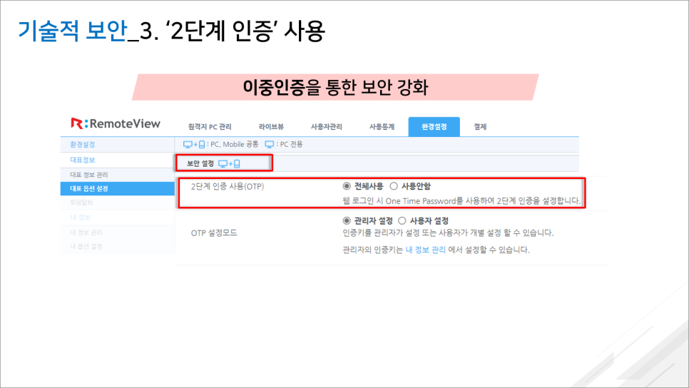 세 번째 기능은 ‘2단계 인증’입니다. 이중인증 기능으로, 특히 금융기관 재택근무 환경에서는 필수로 사용해야 하는 기능인데요. 리모트뷰는 원격제어를 사용하는 사용자를 식별하기 위해 다중인증 절차를 제공하고 있습니다. 그중에서도 일회용 비밀번호 OTP 인증을 활용하실 수 있는데요, 로그인 시 ID, 패스워드와 더불어 OTP 2단계 인증을 적용함으로써 더 안전한 원격근무 환경을 운영하실 수 있습니다. 대표 옵션 설정 > 보안 설정 > 2단계 인증 사용(OTP) '전체 사용' 버튼을 클릭 후 하단의 '적용' 버튼을 클릭하시면 됩니다.