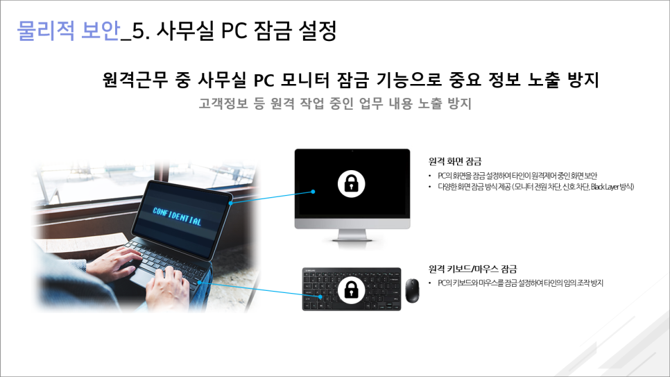 마지막으로 말씀드릴 기능은 ‘사무실 PC 잠금 설정’입니다. 재택근무 중에 사무실에 있는 자기 PC 모니터가 켜져 있는지 아닌지 알 수가 없습니다. 그러다 보니 원격으로 사무실 PC에 접속해 업무를 진행하고 있는데, 마침 사무실에 출근한, 그 업무랑 상관없는 직원이 본다거나 또는 사무실에 외부인이 있을 경우 중요한 정보가 노출될 수 있습니다. 그러나 리모트뷰의 사무실 PC 잠금 설정을 이용하면 아예 모니터 전원을 차단하거나 모니터 화면을 보이지 않게 할 수 있기 때문에 사무실에 있는 내 PC에 다른 사람이 접근하더라도 중요한 정보가 노출되는 것을 미연에 방지할 수 있습니다.