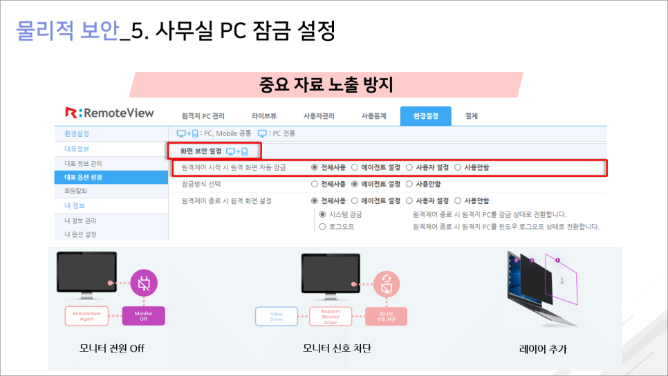 ‘사무실 PC 잠금 설정’ 은 대표 옵션 설정 > 화면 보안 설정 > 원격제어 시작 시 원격 화면 자동 잠금 을 선택하시고 ‘전체사용' 버튼 클릭 후 하단의 '적용' 버튼을 클릭하시면 됩니다. 화면 잠금 방식도 원격지, 여기서는 사무실 PC에 설치된 에이전트가 모니터 전원을 끄는 방식이나 리모트뷰가 사무실 모니터 신호를 차단하는 방식, 또는 모니터 화면에 검은색 레이어를 표시하여 화면을 까맣게 보이지 않게 하는 등 다양한 방식을 제공하고 있습니다.
