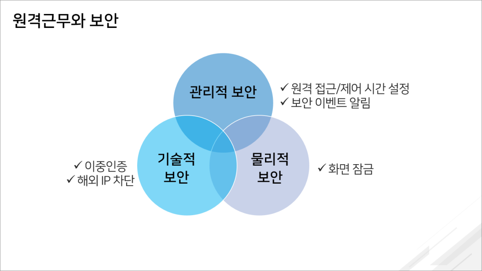 여기까지, 안전한 원격근무를 위해 관리적 / 기술적 / 물리적 보안 관점에서