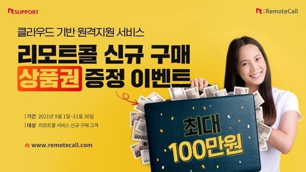 [아이티데일리] 알서포트(대표 서형수)는 자사 원격지원 서비스 ‘리모트콜(RemoteCall)’ 신규 고객을 대상으로 상품권 증정 이벤트를 진행한다고 1일 밝혔다.