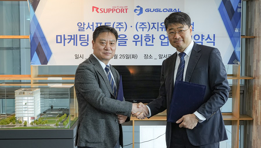 글로벌 비대면•원격 솔루션 전문기업 알서포트가 화상회의 하드웨어 전문기업 ㈜지유글로벌(대표 박주홍)과 ‘최적화된 화상회의 솔루션 제공 및 시장 확대’를 위한 업무협약(MoU)을 체결했다고 26일 밝혔다. 지난 25일 알서포트 서울 본사에서 진행된 업무협약식에는 알서포트 서형수 대표와 지유글로벌 박주홍 대표를 비롯한 양사 주요 임원들이 참석했다.