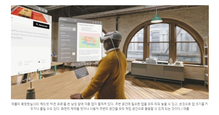 지난달 5일, 미국 캘리포니아주 애플파크에서 열린 애플의 연례 개발자 회의(WWDC)에서 팀 쿡 최고경영자(CEO)가 공개한 신제품 비전 프로는 미래의 기술 시대를 열어가는 제품으로 손꼽힙니다. 이제 우리는 디지털 콘텐츠와 물리적 공간을 매끄럽게 혼합하는 공간컴퓨팅 시대를 맞이하게 되었습니다.