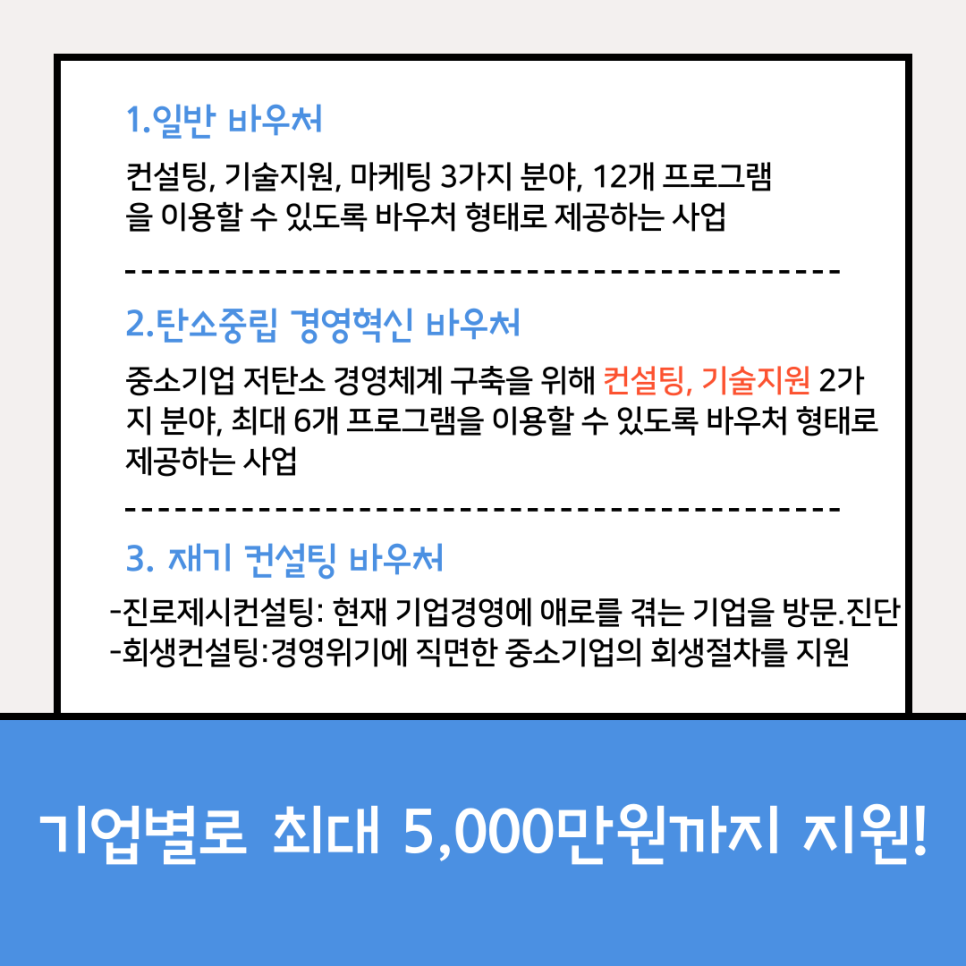 중소기업 혁신바우처는 크게 세 가지 사업으로 나누어 운영되고 있습니다. '일반 바우처','탄소중립 경영혁신 바우처','재기컨설팅 바우처'로 이루어져 있습니다.