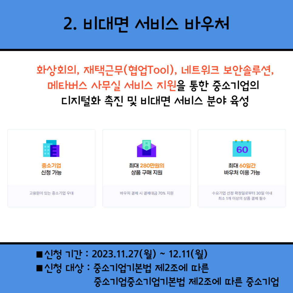 비대면 서비스 바우처는 중소기업의 디지털 전환을 촉진하기 위한 사업으로 중기부의 최대 70% 지원을 받습니다. 화상회의, 재택근무(협업 툴), 네트워크 보안솔루션, 메타버스 사무실 서비스를 중소기업에게 지원합니다.