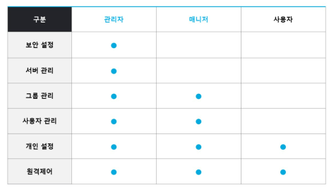 관리자, 매니저, 사용자 3가지 등급으로 구분하여 보안 및 관리 권한을 다르게 부여할 수 있습니다. 계정 비활성화, 에이전트 할당 및 제어 권한 설정 등을 통해 비정상적인 접근을 방지할 수 있습니다.