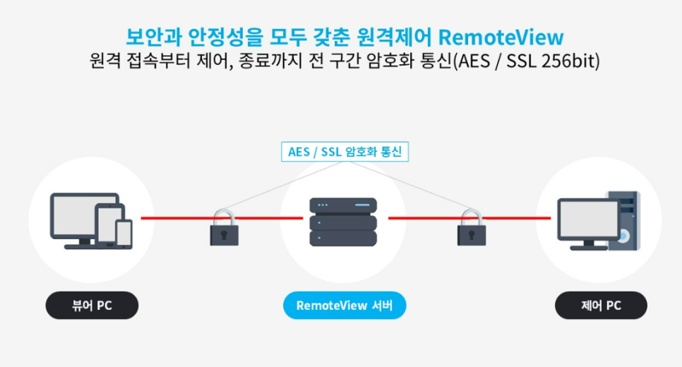 리모트뷰는 보다 강력한 보안 기술을 통해 사용자들에게 안전한 원격 근무 환경을 제공합니다. 특히 AES / SSL 암호화 통신과 같은 고급 기술을 탑재하고 있는 것은 물론, 전자금융감독규정의 보안 사항을 완벽히 준수하고 있습니다.
