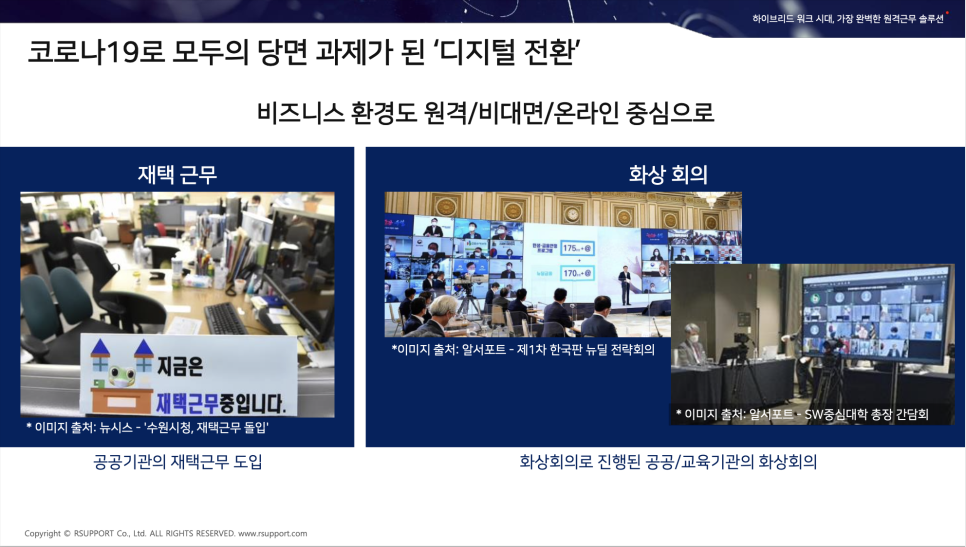 팬데믹으로 우리 모두가 당면한 과제가 있죠. 바로 '디지털 전환'입니다. 비즈니스 환경도 원격, 비대면, 온라인 중심으로 변화하고 있으며 일반 기업뿐만 아니라 망 분리라든가 인프라 면에서 어려울 것 같았던 공공기관에서도 재택근무를 도입하고 전략회의나 간담회 등을 화상회의로 진행하는 시대가 왔습니다. 재택근무 원격근무로 디지털 전환이 속도를 내기 시작했습니다.
