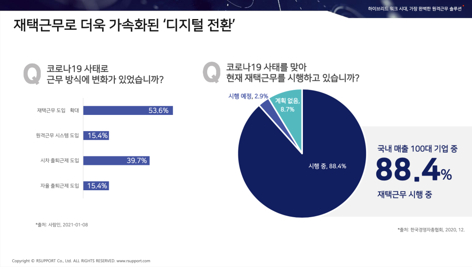 미국이나 유럽 국가에서는 코로나19 사태 이전부터 자율 출근제도나 원격근무를 하고 있었죠. 그러나 우리나라 같은 경우 갑작스럽게 업무 환경이 변화하게 되었습니다. 재택근무가 도입되거나 확대되고, 원격근무 시스템이 도입되었고 시차 출퇴근제나 자율 출퇴근제도 도입되었습니다. 즉 국내 매출 100대 기업 중 88.4%가 재택근무를 시행한 것으로 나타났습니다.
