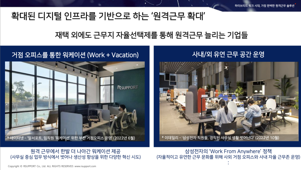 확대된 디지털 인프라를 기반으로 하는 원격근무가 확대되고 있습니다. 그러니까 하이브리드 근무 형태로 재택 외에도 근무지 자율선택제와 같은 다양한 방법을 통해 원격근무를 늘리는 기업들이 늘고 있다는 것이죠.