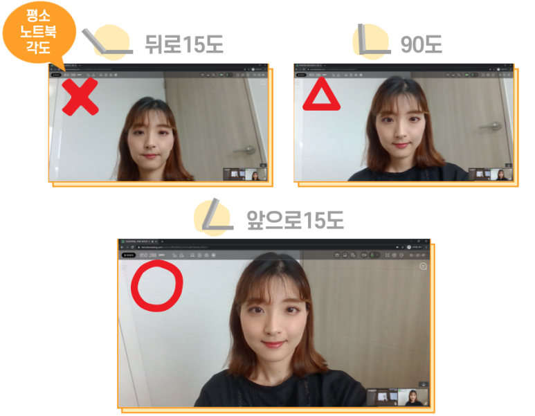 평상시 노트북을 책상 위에 놓고 사용하실 때는 웹캠이 눈 높이보다 아래 쪽에 있기 때문에 시선도 아래로 향하게 되죠.