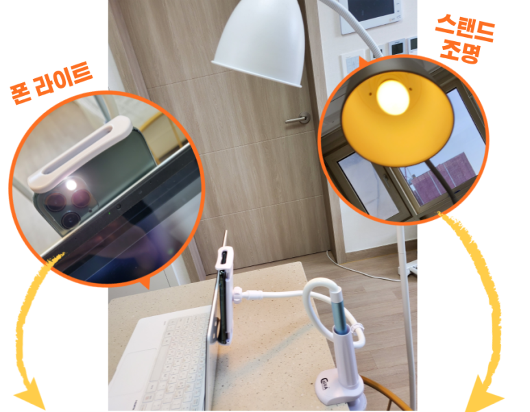 저는 집에 촬영 목적으로 따로 구비해 놓은 조명이 없어, 아이폰 손전등(후레쉬) 과 홈 인테리어를 위해 구매했던 스탠딩 조명을 활용해 봤어요. 모두 전방 45도 정도(앞 위/화상캠 뒷면)에 설치했습니다.