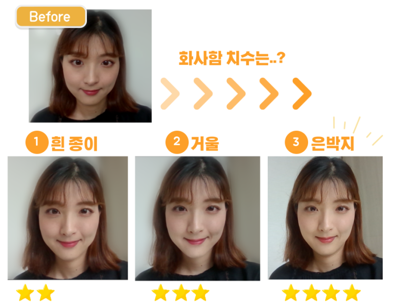 모두 화사해지는 반사판 효과를 느낄 수 있었지만, 생각보다 은박지가 좋은 뽀샤시 효과를 줬던거 같아요.