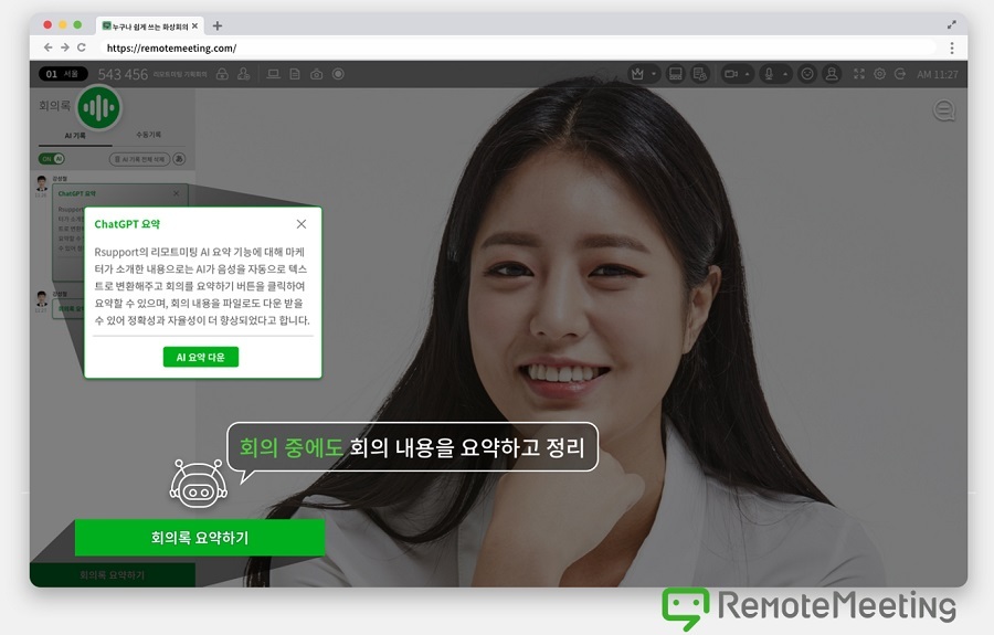 알서포트가 자사 화상회의 서비스 ‘리모트미팅(RemoteMeeting)’의 ‘AI 회의록 요약’ 기능을 업그레이드했다고 19일 밝혔다. 이로써 ‘리모트미팅’ 사용자들은 화상회의가 완전히 종료된 이후에도 회의록을 간편하게 생성, 요약 및 공유할 수 있게 됐다.
