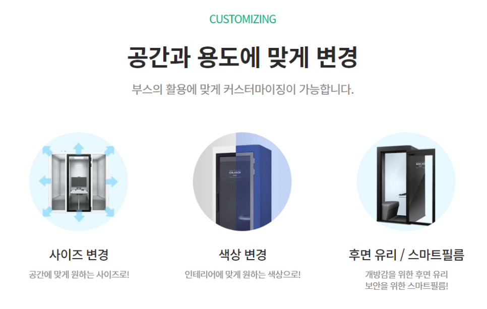 이렇듯 다양한 커스텀을 통해서 현재 사무실에 맞는 맞춤형 방음부스를 설치해 보시는 건 어떠실까요?