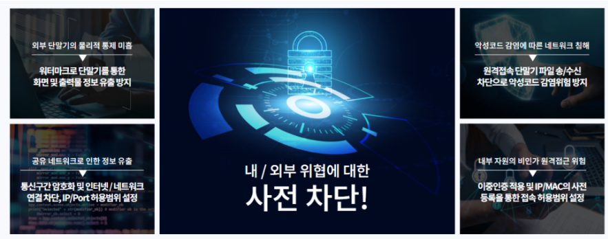 이 밖에도 사용자 등록 및 승인, 화이트리스트 기반의 IP/MAC 접근 제한, 네트워크 통신 암호화, 이중인증(2-Factor Authentication), 원격접속 승인 및 상세 이력 관리, 외부 단말기 파일 송수신 차단, 내부망 접근통제, 유휴 시간 네트워크 연결 차단, 워터마크 등 다양한 관리 및 보안 기능을 제공합니다.