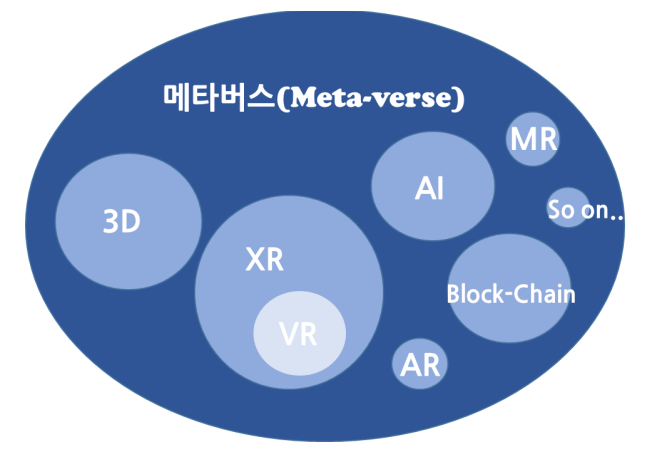 메타버스(Metaverse)는 가공, 추상을 의미하는 그리스어 ‘메타(meta)’와 경험 세계, 현실 세계를 의미하는 ‘유니버스(universe)’의 합성어이다. 현실과 가상의 경계가 사라진 세상을 의미하는 단어의 결합 그대로 가상의 세계를 마치 현실의 세계처럼 살아가는 것이라고 이해하면 된다. 개인과 기업이 함께 콘텐츠를 생산하며 자유롭게 놀 수 있고, 소비할 수 있는 경제 구조를 가졌기에 메타버스를 좀 더 넓은 경제 구조, 일종의 생태계라고 표현할 수 있겠다. 메타버스를 구현하는데 여러 기술적 요소가 필요하다. 대표적으로 3D, 확장현실(XR), 인공지능(AI), 블록체인 (BlockChain) 등이 있다.
