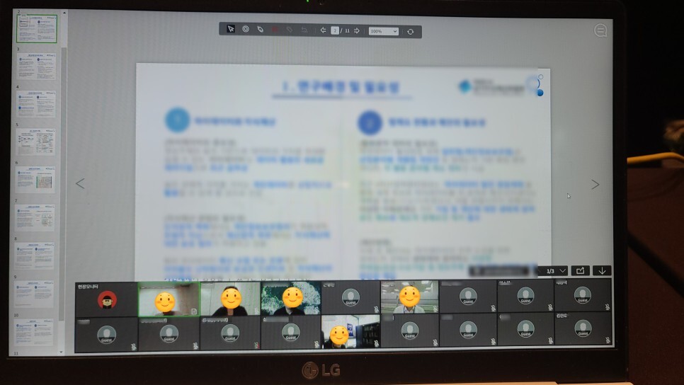 준비된 식순에 맞춰 담당 위원이 발표하는 방식으로 진행되었으며, 주로 리모트미팅의 '문서 공유' 기능을 사용해서 '발표 자료' 와 '발표자의 얼굴'을 함께 보여주면서 많은 정보를 공유했답니다.